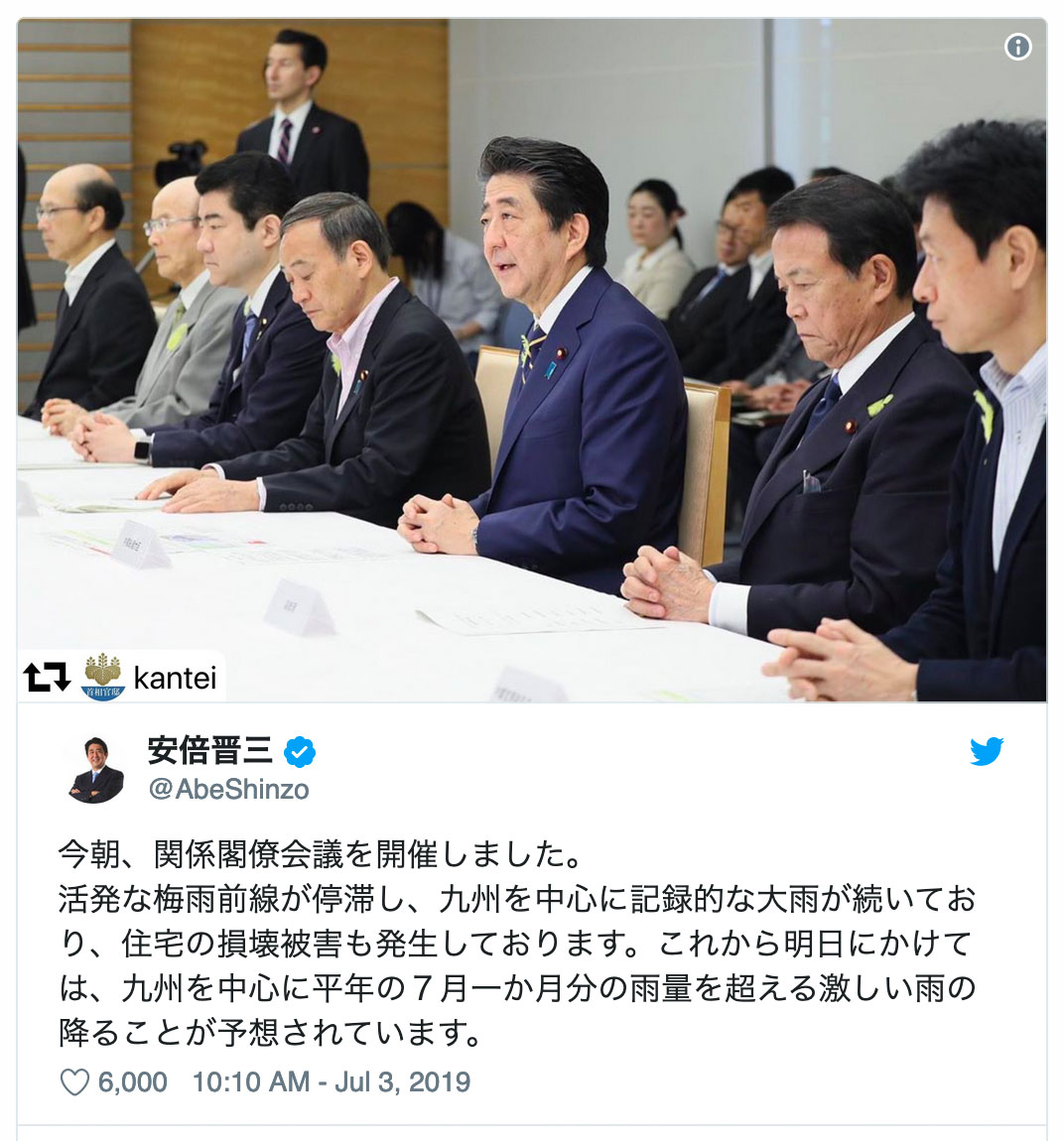 หลังจากการประชุมระดับรัฐมนตรีเมื่อวันพุธนายกรัฐมนตรีญี่ปุ่นชินโซอาเบะทวีทว่ามีเจ้าหน้าที่จากกองกำลังป้องกันประเทศญี่ปุ่น (SDF) เพิ่มขึ้น 14,000 คนเพื่อช่วยเหลือผู้เผชิญเหตุฉุกเฉิน