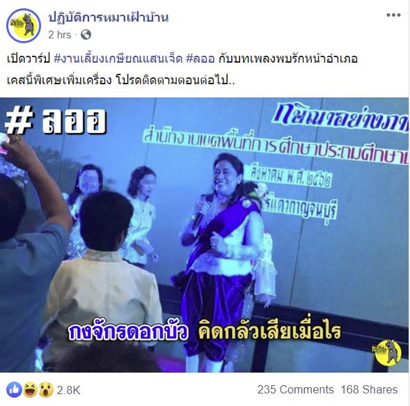 ในขณะที่เพจ ปฏิบัติการหมาเฝ้าบ้าน ได้เผยอีกมุมของ นางสาวลออ วิลัย ผอ.สพป.ชัยนาท เปิดวาร์ป งานเลี้ยงเกษียณแสนเจ็ด ลออ กับบทเพลงพบรักหน้าอำเภอ เคสนี้พิเศษเพิ่มเครื่อง โปรดติดตามตอนต่อไป