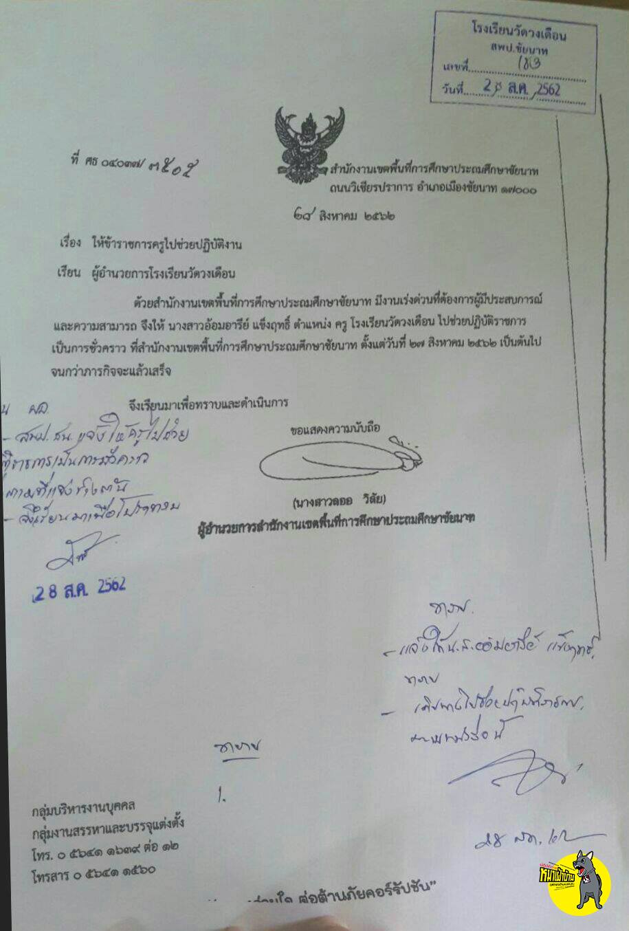 ต่อมาทาง สำนักงานพื้นที่การศึกษาชัยนาท หรือ สพป.ชัยนาท ได้มีหนังสือคำสั่งด่วนที่สุด ลงนามโดย นางสาวลออ วิลัย ผอ.สำนักงานเขตพื้นที่การศึกษาประถมศึกษาชัยนาท มีคำสั่งให้ครูอ้อม ย้ายไปช่วยราชการที่ สพป.ชัยนาท โดยให้เหตุผลว่าเพื่อความเหมาะสมระหว่าการสอบสวนเรื่องท้วงติงเรื่องคุณภาพอาหารกลางวัน โดยจะจัดหน้าที่งานให้ตามความเหมาะสม และให้มีผลทันทีตั้งแต่วันที่27 ส.ค.62 (ออกหนังสือ 28ส.ค.62) เเม้ว่าทาง ครูอ้อมเองได้ทำหนังสือยื่นอุทธรณ์คำสั่งย้าย ต่อ สพป.ชัยนาท เเต่ก็ไม่เป็นผล