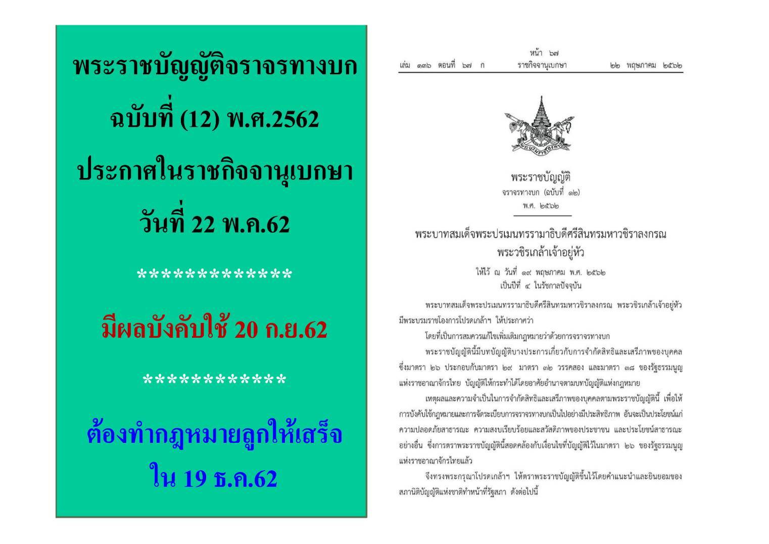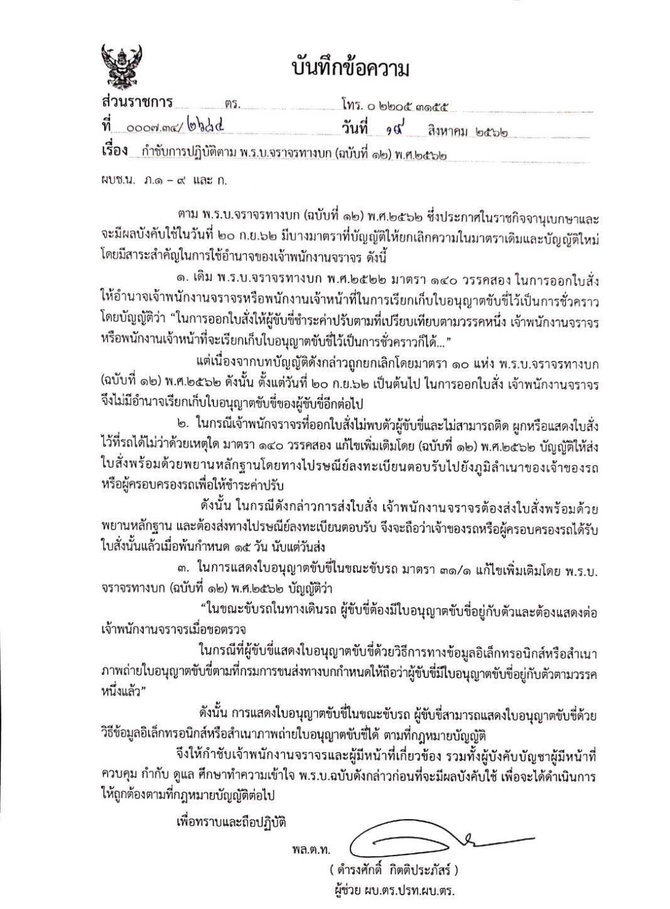 15 กันยายน พล.ต.ท.ดำรงศักดิ์ กิตติประภัสร์ ผู้ช่วย ผบ.ตร. กล่าวถึงกฎหมายบางมาตราที่บัญญัติไว้ใน พ.ร.บ.จราจรทางบก ฉบับที่ 12 พ.ศ.2562 ซึ่งจะมีผลบังคับใช้จริงในวันที่ 20 กันยายนนี้