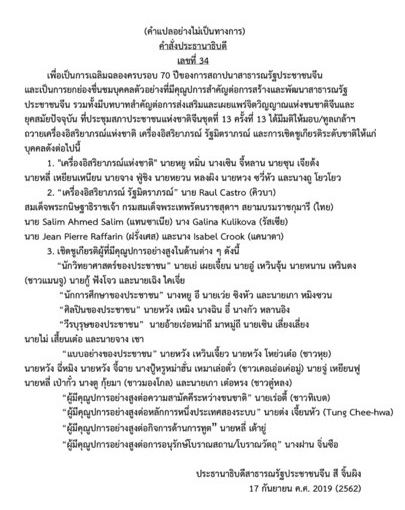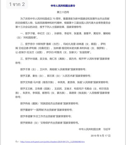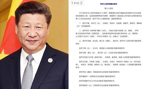 นายสี จิ้นผิง ประธานาธิบดีสาธารณรัฐประชาชนจีน ได้ลงนามในคำสั่งประธานาธิบดี มอบ/ทูลเกล้าฯ ถวายเครื่องอิสริยาภรณ์แห่งชาติ เครื่องอิสริยภรณ์รัฐมิตรภรณ์ และการเชิดชูเกียรติระดับชาติ ให้แก่บุคคลสำคัญระดับโลกที่มีคุณูปการสำคัญต่อการสร้างและพัฒนาสาธารณรัฐประชาชนจีน รวมทั้งมีบทบาทสำคัญต่อการส่งเสริมและเผยแพร่จิตวิญญาณแห่งชนชาติจีน