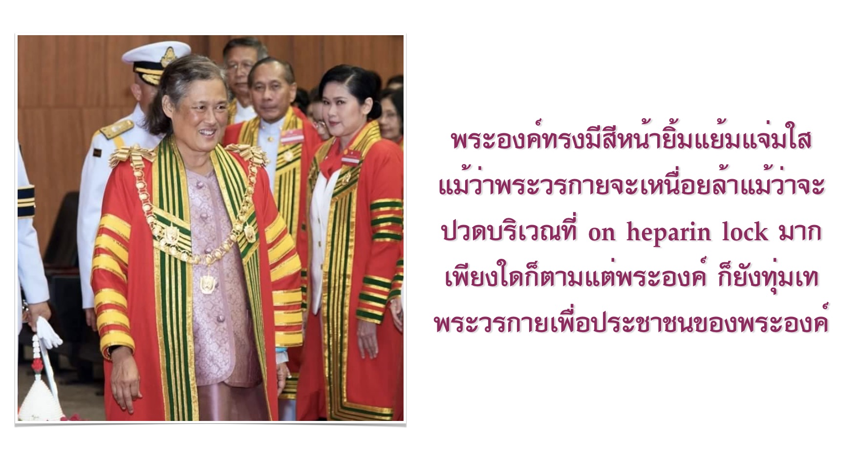 ถ้าใครเคย on heparin lock จะรู้ว่ามันแสบๆเคืองๆและบางครั้งก็จะ ปวดเป็นพักๆแต่พระองค์ทรงมีสีหน้ายิ้มแย้มแจ่มใสแม้ว่าพระวรกายจะเหนื่อยล้าแม้ว่าจะปวดบริเวณที่ on heparin lock มากเพียงใดก็ตามแต่พระองค์ ก็ยังทุ่มเทพระวรกายเพื่อประชาชนของพระองค์