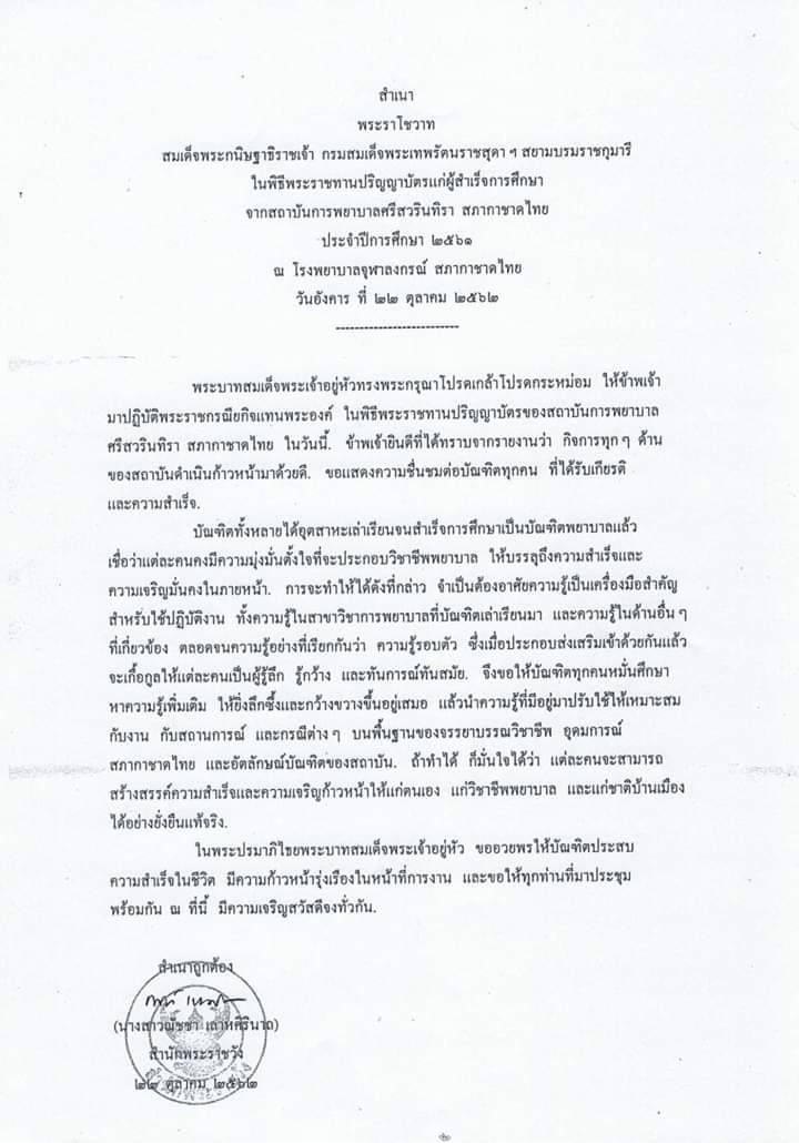 วันนี้ ๒๒ ตุลาคม ๒๕๖๒ สมเด็จพระกนิษฐาธิราชเจ้า กรมสมเด็จพระเทพรัตนราชสุดา ฯ สยามบรมราชกุมารี เสด็จพระราชดำเนินแทนพระองค์ไปในการพระราชทานปริญญาบัตรแก่ผู้สำเร็จการศึกษาหลักสูตรพยาบาลศาสตรบัณฑิต สถาบันการพยาบาลศรีสวรินทิรา สภากาชาดไทย ประจำปีการศึกษา ๒๕๖๑ จำนวน ๑๙๗ คน ณ ห้องประชุม Auditorium ชั้น ๑๒ อาคารภูมิสิริมังคลานุสรณ์ โรงพยาบาลจุฬาลงกรณ์ สภากาชาดไทย