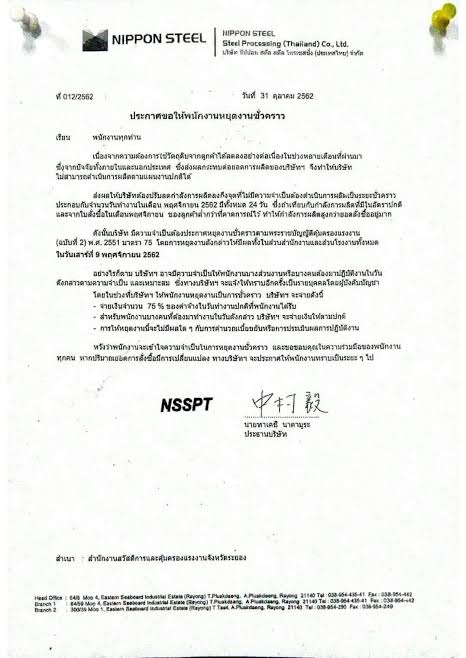 ปัจจบันสถานการณ์เศรษฐกิจบ้านเราบางคนบอกโต แต่โตช้า บางคนว่าไม่โตแต่ที่แน่ๆโรงงาน กิจการใหญ่หลายแห่ง ต้องทยอยกันประกาศปิดตัวลงเรื่อยๆ และล่าสุด วันที่ 31 ตุลาคม 2562 ที่ผ่านมา บริษัทนิปปอนสตีล สตีล โพรเซสซิ่ง (ประเทศไทย) จำกัด ซึ่งเป็นบริษัทในกลุ่ม NIPPON STEEL จากประเทศญี่ปุ่น ก็ได้ออกประกาศขอให้พนักงานหยุดงานชั่วคราวแล้ว โดยได้ระบุข้อความเอาไว้ว่า