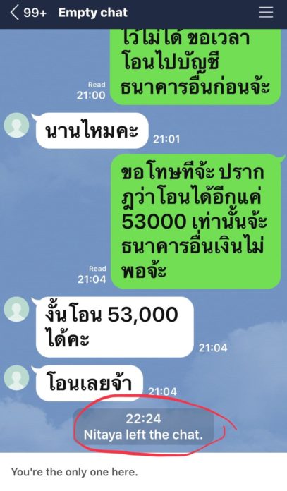 จากนั้นจู่ๆ มีข้อความจากผู้ใช้แอพพลิเคชันไลน์รายเดิมทักแชทเข้ามาหาตนโดยมีใจความระบุข้อความว่า “โทรศัพท์โอนเงินได้ไหม จะฝากโอนเงินไปธุระด่วนตู้เสีย ยอด 47,000 บาท ช่วงเช้าจะโอนคืนให้” จากนั้นก็ส่งเลขบัญชีระบุธนาคารไทยพาณิชย์ ชื่อบัญชีคือ Miss Napas Chamson พร้อมทั้งขอให้ตนส่งสลิปกลับไปให้อีกครั้งหลังทำธุรกรรมทางการเงินเสร็จสิ้น ตนจึงรีบโอนไปให้ในทันที
