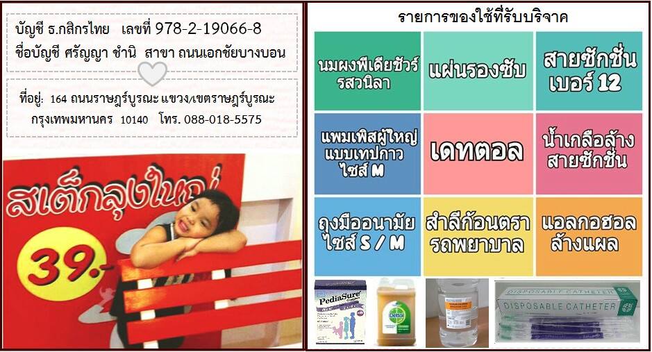หากท่านใดอยากช่วยน้องการ์ตูน น้องยังต้องใช้ของใช้อยู่มีรายการตามนี้ค่ะ สามารถบริจาคโดยส่งทางไปรฯ มาที่ร้านสเต็กคุณแม่การ์ตูน ที่อยู่ 164 ถนนราษฎร์บูรณะ แขวง/เขตราษฎร์บูรณะ กรุงเทพฯ 10140 ค่ะ