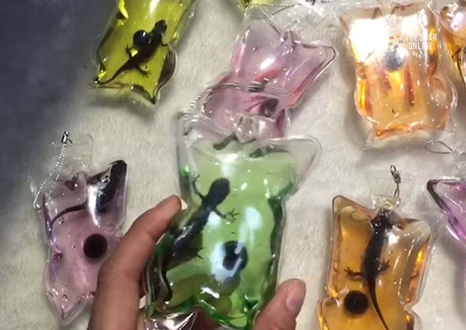 นักข่าวจาก The Star Online ได้รายงานว่าบนถนนในปักกิ่งและเมืองใหญ่ๆ ของประเทศจีนสัตว์ยังพวงกุญแจที่ทำจากสิ่งมีชีวิตเช่นเต่าและ จิ้งเหลน ถูกผนึกไว้ในถุงพลาสติกที่เต็มไปด้วยของเหลวสีและขายเป็นพวงกุญแจและสานคล้องโทรศัพท์มือถืออยู่ สัตว์เหล่านี้ได้รับการปฏิบัติเสมือนเป็นวัตถุแทนที่จะเป็นสิ่งมีชีวิตสัตว์เหล่านั้นต้องอดทนต่อการถูกกักขังอย่างรุนแรงและโดยปกติแล้วการหายใจไม่ออกและความตาย เพื่อความเพลิดเพลินของมนุษย์