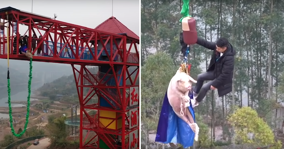 วิดีโอจากสวนสนุก Meixin Red Wine Town ในฉงชิ่งทางตะวันตกเฉียงใต้ของจีนแสดงให้เห็นว่ามีคนผูกหมูไว้ที่เสาและนำขึ้นไปบนยอดหอคอยบนหอคอยสูง 68 เมตร (223 ฟุต) จากนั้นก็เอาเชือกบันจี้จัมผูกกับตัวมันใส่เสื้อคลุมบนหมูและไปที่ขอบของแพลตฟอร์ม หมูที่น่าสงสารกรีดร้องอย่างโหยหวนในความทุกข์ในขณะที่ฝูงชนหัวเราะและกรีดร้อง หมูถูกทิ้งไว้ก่อนที่จะถูกนำกลับขึ้นมาโดยคนของสวนสนุก
