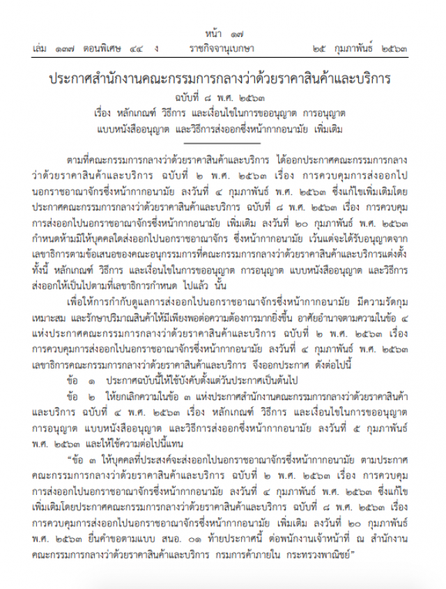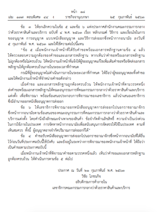 เว็บไซต์ราชกิจจานุเบกษา เผยแพร่ประกาศสำนักงานคณะกรรมการกลางว่าด้วยราคาสินค้าและบริการ ฉบับที่ 8 พ.ศ. 25863 เรื่อง หลักเกณฑ์ วิธีการ และเงื่อนไขในการขออนุญาต การอนุญาต แบบหนังสืออนุญาต และวิธีการส่งออกซึ่งหน้ากากอนามัย เพิ่มเติม