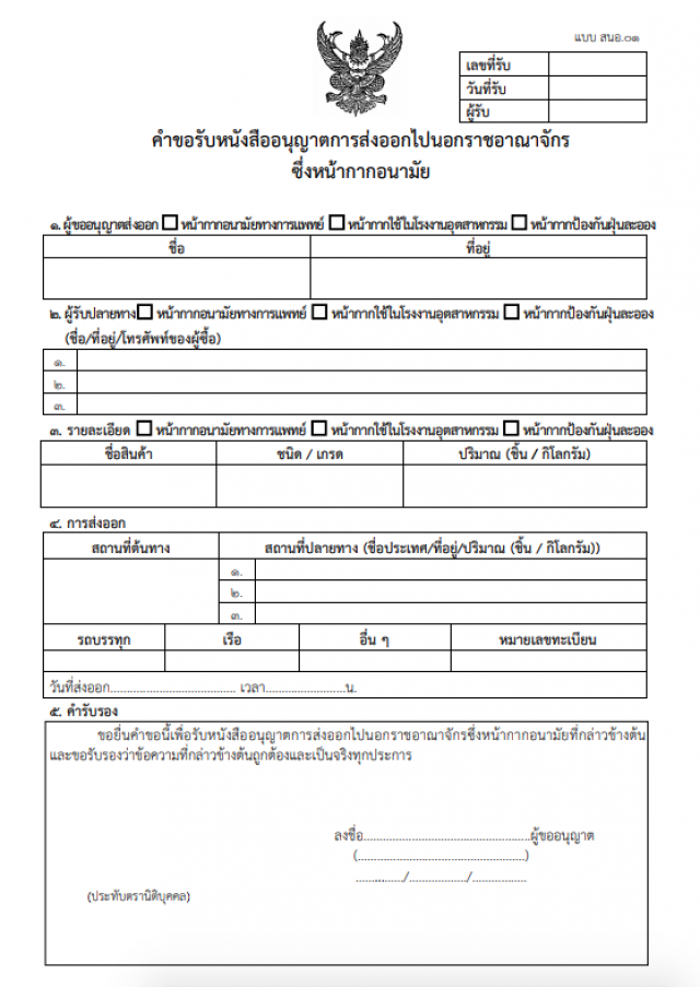 "ข้อ 3 ให้บุคคลที่ประสงค์จะส่งออกไปนอกราชอาณาจักรซึ่งหน้ากากอนามัย ตามประกาศคณะกรรมการกลางว่าด้วยราคาสินค้าและบริการ ฉบับที่ 2 พ.ศ. 2563 เรื่อง การควบคุมการส่งออกไปนอกราชอาณาจักรซึ่งหน้ากากอนามัย ลงวันที่ 4 กุมภาพันธ์ พ.ศ. 2563 ซึ่งแก้ไขเพิ่มเติมโดยประกาศคณะกรรมการกลางว่าด้วยราคาสินค้าและบริการ ฉบับที่ 8 พ.ศ. 2563 เรื่องการควบคุมการส่งออกไปนอกราชอาณาจักรซึ่งหน้ากากอนามัย เพิ่มเติม ลงวันที่ 20 กุมภาพันธ์ พ.ศ. 2563 ยื่นคำขอตามแบบ สนอ. 01 ท้ายประกาศนี้ ต่อพนักงานเจ้าหน้าที่ ณ สำนักงานคณะกรรมการกลางว่าด้วยราคาสินค้าและบริการ กรมการค้าภายใน กระทรวงพาณิชย์"