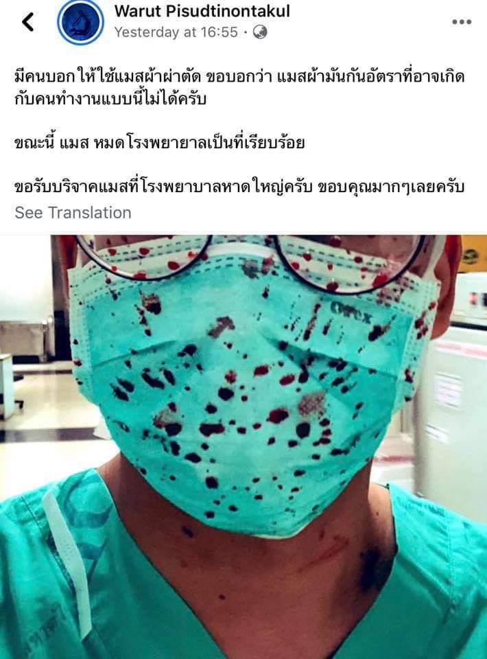 นาย สาธิต ปิตุเตชะ รัฐมนตรีช่วยว่าการกระทรวงสาธารณสุข ให้สัมภาษณ์สำนักข่าวไทยกรณีที่โลกโซเชี่ยล มีการเผยแพร่ และแชร์ภาพหมอที่สวมใส่หน้ากากอนามัย แล้วมีหยดเลือดกระจายเต็มเสื้อ และหน้ากาก ซึ่งโพสต์โดยหมอที่ใช้ชื่อเพจเฟสบุ๊กว่า Warut Pisudtinontakon ระบุว่า “มีคนบอกให้ใช้แมสผ้าผ่าตัด ขอบอกว่า แมสผ้ามันกันอัตรายที่อาจเกิดกับคนทำงานแบบนี้ไม่ได้ครับ ขณะนี้ แมส หมดโรงพยายาลเป็นที่เรียบร้อย ขอรับบริจาคแมสที่โรงพยาบาลหาดใหญ่ครับ ขอบคุณมากๆเลยครับ”