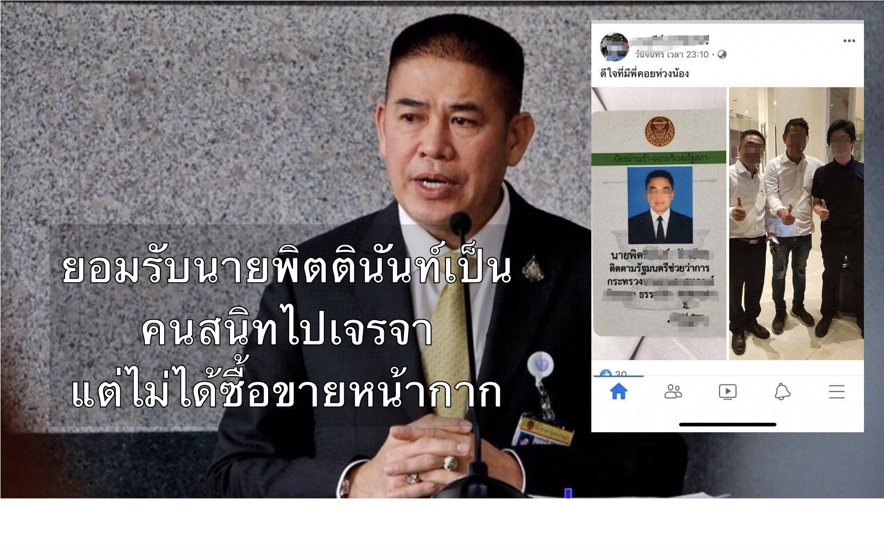 (2) ส่วนนายพิตตินันท์ รักเอียด ซึ่งเป็นคณะทำงานของข้าพเจ้า นั้น ได้ยืนยันกับข้าพเจ้าว่าตนได้ไปพบกับนายศรสุวีร์ตามคำแนะนำของเพื่อนเพื่อพูดคุยเรื่องหน้ากากอนามัยจริง โดยได้ไปพบกันที่โรงแรมแมริออท (ประตูน้ำ) กรุงเทพมหานคร แต่ไม่ได้มีการซื้อขายหน้ากากอนามัยกันและไม่เคยรู้จักกันกับนายศรสุวีร์มาก่อนโดยเป็นการพบกันครั้งแรก