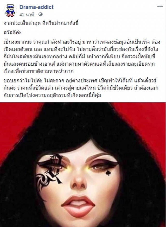เป็นงงมากนะ ว่าคุณกำลังทำอะไรอยู่ มาหาว่าเพจลงข้อมูลอันเป็นเท็จ ต้องเปิดเผยตัวตน เออ แทนที่จะไปจับ ไปตามสืบว่ามันกี่ยวข้องกับเรื่องนี้ยังไง ก็มันโพสต์ของมันเองทุกอย่าง คลิปก็มี หน้ากากก็เพียบ ก็ตรวจเช็คบัญชีมันและคนรอบข้างเอาเส้ แต่มาตามหาตัวคนแฉที่เสี่ยงลงรายละเอียดทุกเรื่องเพื่อช่วยชาติตามหาหน้ากาก