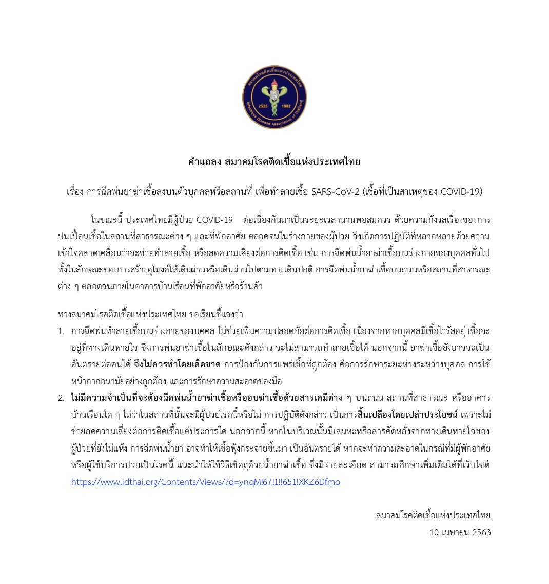 สมาคมโรคติดเชื้อแห่งประเทศไทยออกหนังสือแถลงการณ์ เรื่อง การฉีดพ่นยาฆ่าเชื้อลงบนตัวบุคคลหรือสถานที่ เพื่อทําลายเชื้อ SAR-Cov-2 (เชื้อที่เป็นสาเหตุของ COVID-19)