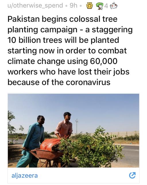 ทำให้มีคนตกงานจำนวนมาก รัฐบาลจึงมีโครงการ 10 Billion Tree Tsunami หรือปลูกต้นไม้หมื่นล้านต้นขึ้นมา