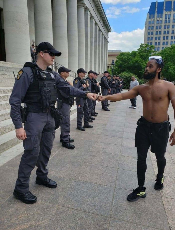 กลุ่มชายผิวดำยืนป้องกันไม่ให้เกิดการปะทะระหว่างตำรวจกับผู้ประท้วง