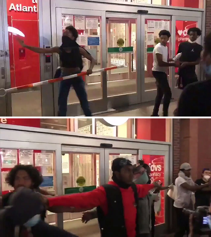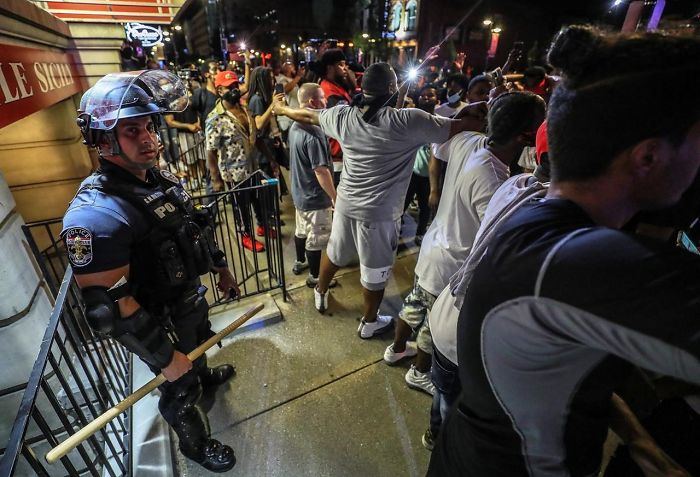 ตำรวจอาสาที่เป็นคนดำช่วยกันปกป้องไม่ให้ผู้ประท้วงทำลัายข้างของและปล้นร้านค้า
