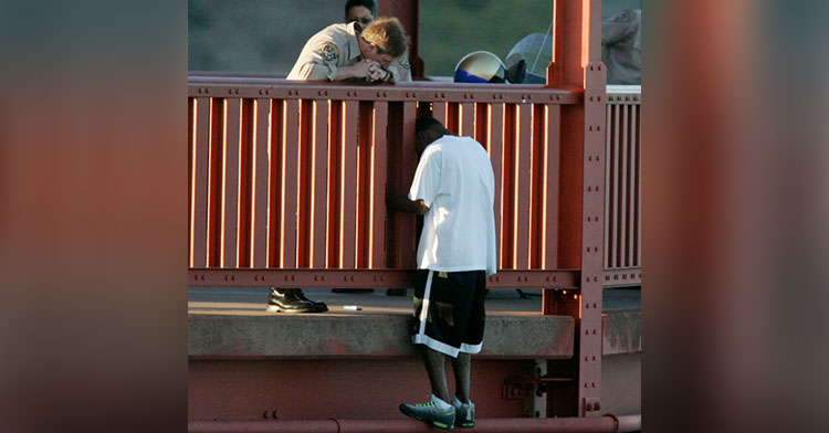 เช่นชายผิวดำคนนี้ Kevin เขาปีนข้ามราวสะพานในวันนั้นด้วยความตั้งใจในการกระโดดฆ่าตัวตาย เพราะลูกสาวของเขาเกิดก่อนกำหนดทำให้ครอบครัวจ้องเป็นหนี้โรงพยาบาลถึง 250,000 เหรียญ เขาหดหู่และเต็มไปด้วยความสิ้นหวังอย่างลึกล้ำ เขาเอาหัวของเขาเกาะแค่ราวสะพานไว้และข่มขู่เจ้าหน้าที่บริกส์ทุกครั้งที่เขาเข้ามาใกล้