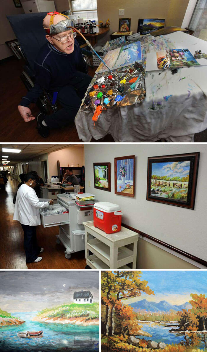 Steve Chambers วาดภาพทิวทัศน์ของเรือสองลำโดยถือพู่กันในปากเพราะสภาพความพิการหายากเขาเกิดมาพร้อมกับแขนของเขาปราศจากกล้ามเนื้อ