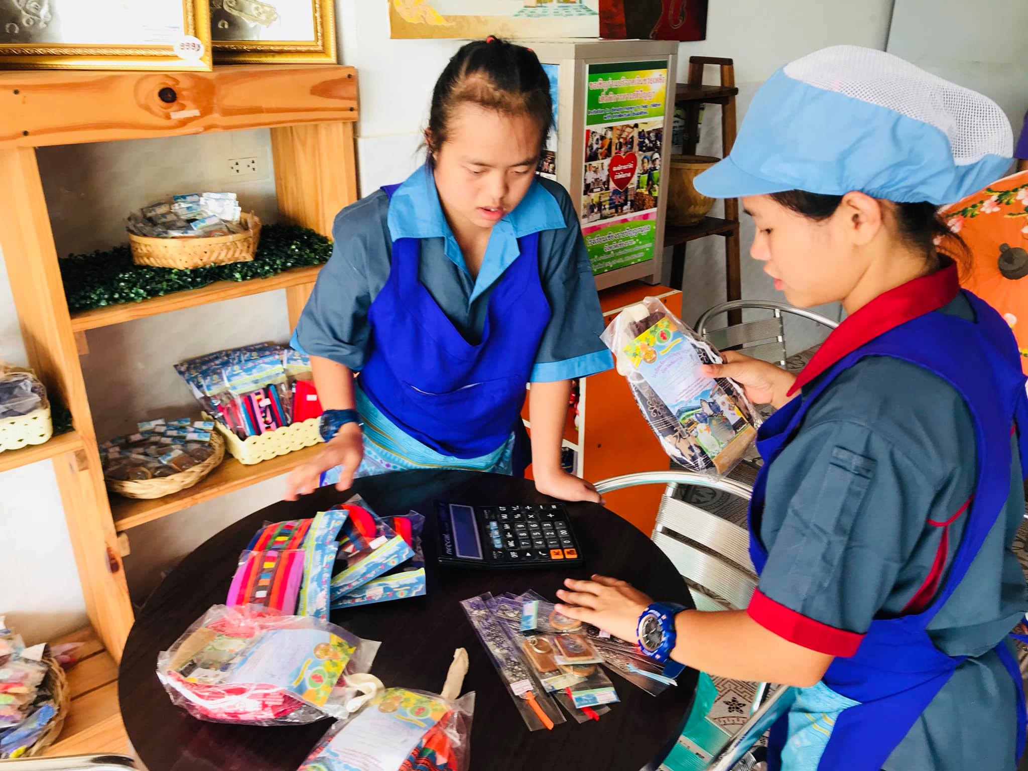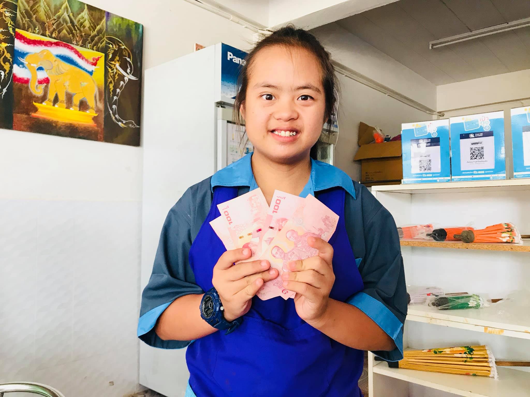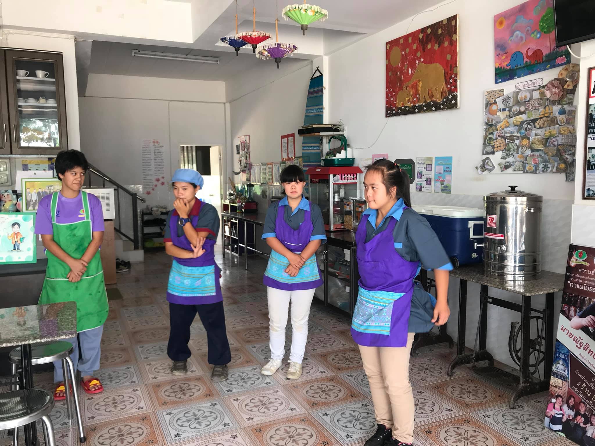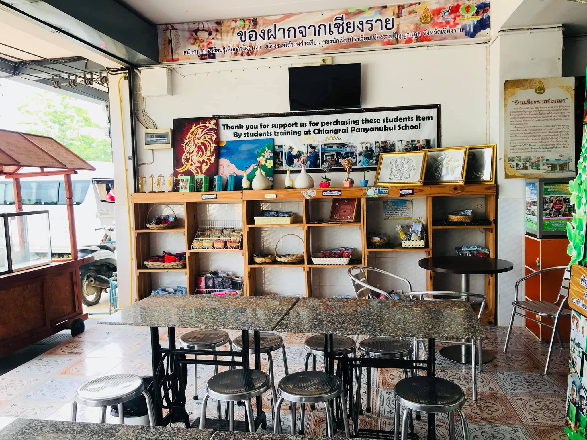ในร้านมีขายของที่ระลึก ฝีมือจากโรงเรียนเชียงรายปัญญานุกูล แต่ก็ไม่มีคนซื้ออีก พอบอกว่า เดี๋ยวพี่ๆ อุดหนุน ทุกคนวิ่งออกมาพรีเซนต์ใหญ่ ว่าอันนี้คืออะไร วันนี้ช่วยอุดหนุนน้องๆ น้ำหวาน -ของที่ระลึก 500 บาท ทุกคนยิ้ม-ไหว้ลูกค้าดีมาก “ได้จับเงิน ตื่นเต้นจังค่ะ”