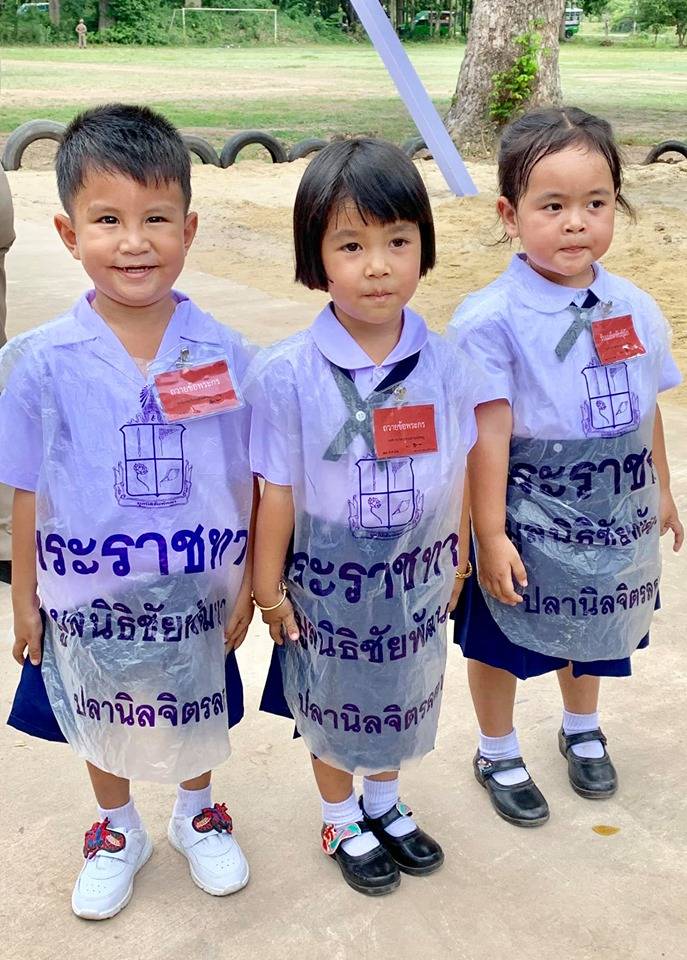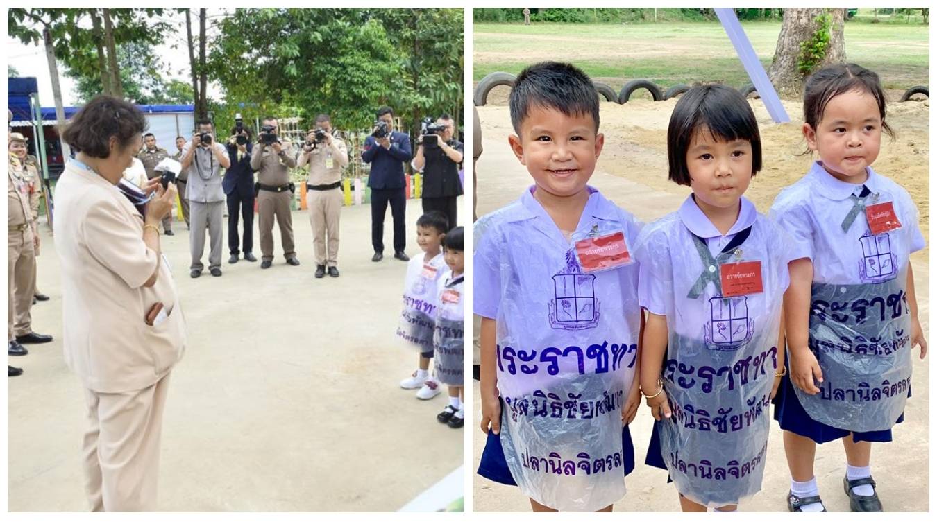 ในการนี้ นักเรียนเด็กเล็ก จำนวน ๓ คน เฝ้า ในชุดนักเรียนพร้อมเสื้อคลุมที่ทำจากถุงพลาสติกเขียนว่า ปลานิลจิตรลดา พระราชทาน มูลนิธิชัยพัฒนา ซึ่งเป็นถุงบรรจุลูกปลานิลจิตรลดาที่พระราชทานแก่ชุมชนแห่งนี้