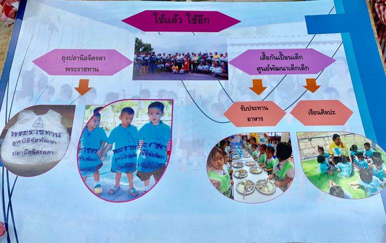 สมาชิกในหมู่บ้านเห็นว่าถุงดังกล่าวเป็นของมีค่า เพราะได้รับพระราชทานมาจากพระองค์ท่าน ประกอบกับถ้านำไปทิ้งจะทำให้เกิดปัญหาสิ่งแวดล้อมจึงนำถุงมาดัดแปลงเป็นผ้ากันเปื้อนเวลารับประทานอาหารหรือทำงานศิลปะ