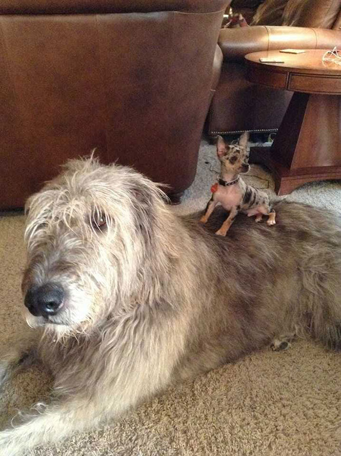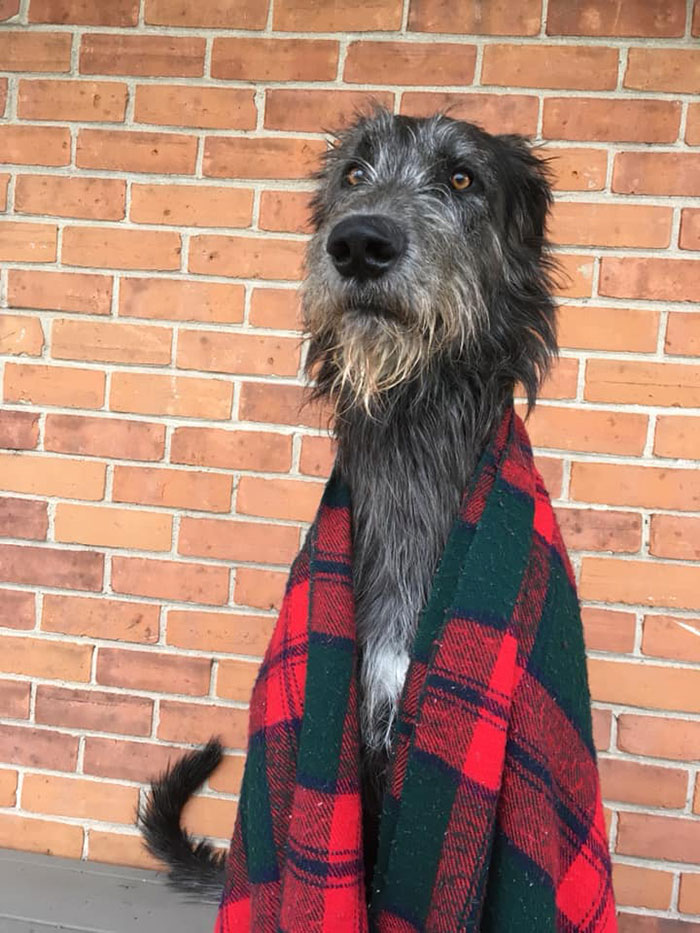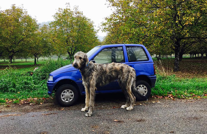 ไอริชวูล์ฟฮาวด์ เชื่อกันว่าเป็นสายพันธุ์มีอายุมากว่า 391 ปี ได้รับการตั้งชื่อตามส่วนผสมของสุนัขล่าเนื้อถูกใช้โดย Gaels เป็นสุนัขล่าสัตว์ที่เรียกพวกเขาว่าCú Faol (สุนัขล่าเนื้อ) ในขณะที่พวกมันอาจฟังดูเหมือนตำนาน - แต่ตอนนี้พวกมันเป็นสัตว์เลี้ยงที่น่ารักน่ารักและดูต๊องๆบางครั้ง ตามมาตรฐานสหพันธ์สุนัขโลกอย่างเป็นทางการความสูงที่ต้องการคือ 32 นิ้ว (81 ซม.) ถึง 34 นิ้ว (86 ซม.)