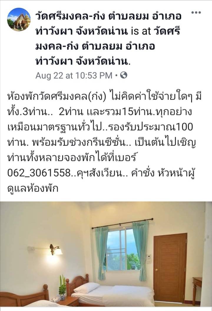 22 สิงหาคม 62 เฟสบุควัดศรีมงคล-ก๋ง ได้เผยแพร่ข้องามประชาสัมพันธ์ว่า "ห้องพักวัดศรีมงคล(ก๋ง) ไม่คิดค่าใช้จ่ายใดๆ มีทั้ง.3ท่าน.. 2ท่าน เเละรวม15ท่าน.ทุกอย่างเหมือนมาตรฐานทั่วไป..รองรับประมาณ100ท่าน. พร้อมรับช่วงกรีนซีซั่น.. เป็นต้นไปเชิญท่านทั้งหลายจองพักได้ที่เบอร์ 062_3061558..คุณสังเวียน.. คำชั่ง หัวหน้าผู้ดูแลห้องพัก"