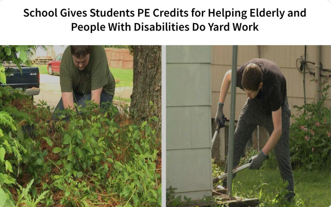 การทำสวน ตัดต้นไม่รอบๆบ้านถือว่าเป็นการออกกำลังกายที่ดี เเกมือนการเรียนพละศึกษา เด็กนักเรียนที่ Alternative Learning Center (ALC) ในไอโอว่าเลยสามารถที่จะรับคะแนนในวิชาพละศึกษาด้วยการอาสาไปทำงานสวนให้กับคนในชุมชน ที่เป็นผู้สูงอายุหรือคนพิการ