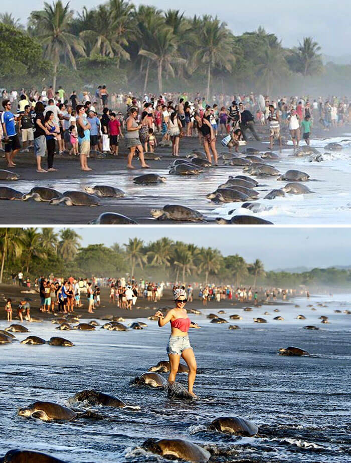 ที่ชายหาดในคอสตาริกา นักท่องเที่ยวยืนถ่ายรูปขวางทางเต่าที่จะขึ้นมาวางไข่โดยไม่สนใจคำเตือนของเจ้าหน้าที่