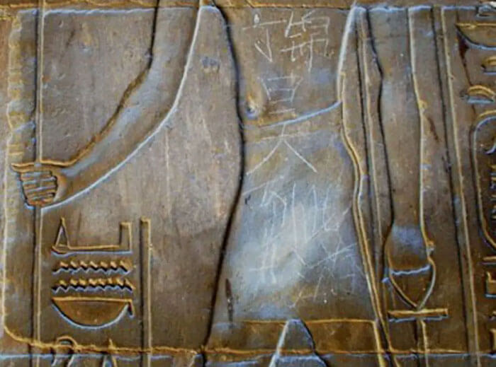 นักท่องเที่ยวอสยุ 15 ปี (จีนอีกแล้ว) เขียนข้อความว่า "ดิง จินหัว (ชื่อมัน) มาเยือน" บนภาพนูนต่ำอายุกว่า 3500 ปี ที่อียิปต์