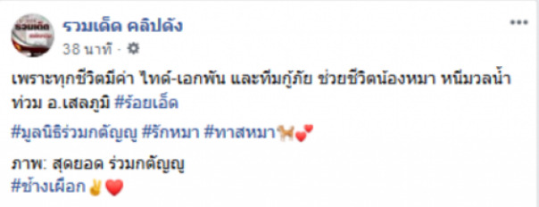 วันที่ 2 กันยายนที่ผ่านมา และเพจ รวมเด็ด คลิปดังได้โพสต์ข้อความว่า “เพราะทุกชีวิตมีค่า ไทด์ เอกพัน และทีมกู้ภัย ช่วยชีวิตน้องหมา หนีมวลน้ำท่วม อ.เสลภูมิ ร้อยเอ็ด มูลนิธิร่วมกตัญญู รักหมา ทาสหมา ภาพ: สุดยอด ร่วมกตัญญู ช้างเผือก”