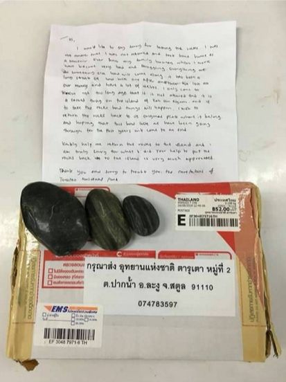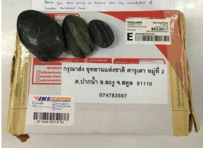 เจ้าหน้าที่จากอุทยานแห่งชาติตะรุเตาแบ่งปันภาพถ่ายบน Facebook ที่แสดงก้อนหินพร้อมจดหมายที่ส่งกลับมาที่อุทยานโดยนักท่องเที่ยวจากทั่วโลกที่พยายามสอบถามที่อยู่อุทยานทางออนไลน์และส่งสิ่งของโดยเฉพาะก้อนหินกลับมาโดยบอกเล่าเกี่ยวกับความโชคร้ายที่เกิดขึ้นหลังจากเอาก้อนหินกลับไปที่บ้าน