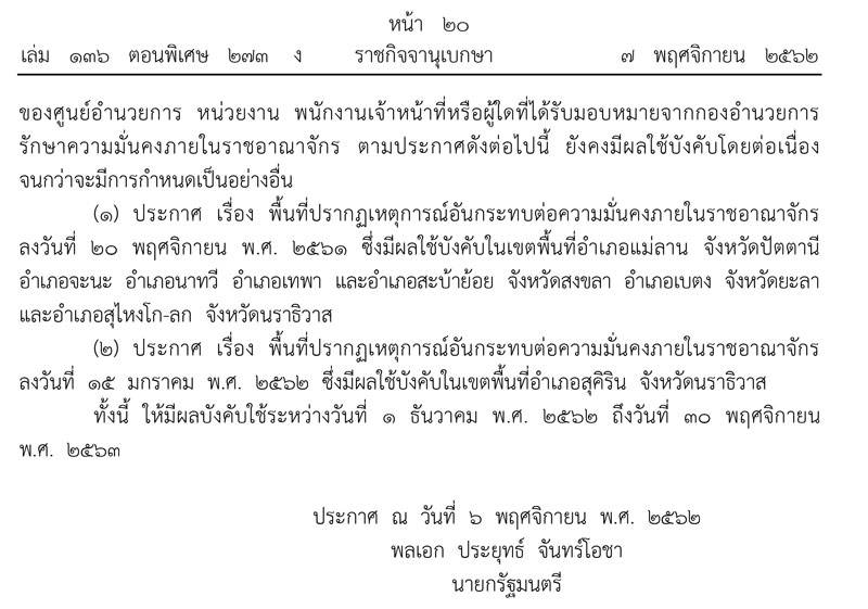 ขณะที่ก่อนหน้านี้ในวันเดียวกันเว็บไซต์ราชกิจจานุเบกษา เผยแพร่เรื่อง “พื้นที่ปรากฏเหตุการณ์อันกระทบต่อความมั่นคงภายในราชอาณาจักร” ระบุว่า ด้วยสถานการณ์ในเขตพื้นที่อำเภอแม่ลาน จังหวัดปัตตานี อำเภอจะนะ อำเภอนาทวี อำเภอเทพา และอำเภอสะบ้าย้อย จังหวัดสงขลา อำเภอเบตง จังหวัดยะลา และอำเภอสุไหงโก-ลก และอำเภอสุคิริน จังหวัดนราธิวาส ยังคงปรากฏเหตุการณ์อันกระทบต่อความมั่นคงภายในราชอาณาจักร ซึ่งปรากฏเห็นชัดในรูปแบบของเหตุการณ์รุนแรง ดังนั้นเพื่อให้เกิดความต่อเนื่องในการปฏิบัติงาน รวมทั้งการบริหารจัดการรักษาความสงบ และความปลอดภัยให้มีเอกภาพและเกิดประสิทธิภาพอย่างสูงสุด จึงมีความจำเป็นอย่างยิ่งที่ยังคงต้องกำหนดมาตรการป้องกันไว้ เช่นเดิม เพื่อมิให้สถานการณ์ขยายตัวลุกลาม หรือหากเกิดเหตุการณ์ รุนแรงขึ้น เจ้าหน้าที่ของรัฐสามารถแก้ไขปัญหาให้ยุติโดยเร็วโดยไม่ส่งผลกระทบต่อความมั่นคงภายในราชอาณาจักร โดยให้ประกาศ เรื่องพื้นที่ปรากฏเหตุการณ์อันกระทบต่อความมั่นคงภายในราชอาณาจักร ซึ่งมีผลใช้บังคับในเขตพื้นที่อำเภอแม่ลาน จังหวัดปัตตานี อำเภอจะนะ อำเภอนาทวี อำเภอเทพา และอำเภอสะบ้าย้อย จังหวัดสงขลา อำเภอเบตง จังหวัดยะลา และอำเภอสุไหงโก-ลก จังหวัดนราธิวาส และประกาศ เรื่อง พื้นที่ปรากฏเหตุการณ์อันกระทบต่อความมั่นคงภายในราชอาณาจักร ซึ่งมีผลใช้บังคับในเขตพื้นที่อำเภอสุคิริน จังหวัดนราธิวาส ทั้งนี้ให้มีผลบังคับใช้ระหว่างวันที่ 1 ธ.ค.2562-วันที่30 พ.ย.2563