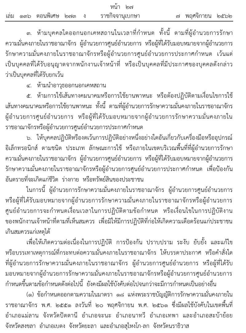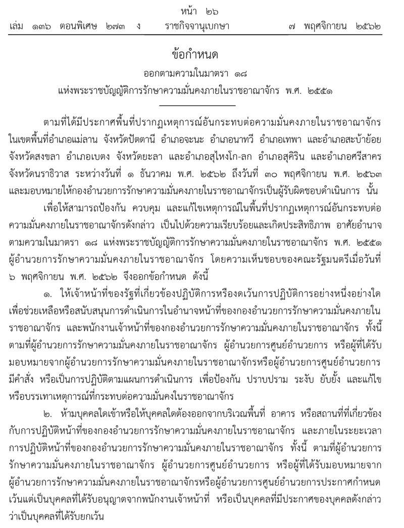ตามที่ผู้อำนวยการกอ.รมน.หรือผู้อํานวยการศูนย์อํานวยการประกาศกำหนด และห้ามนำอาวุธออกนอกเคหะสถาน รวมถึงห้ามการใช้เส้นทางคมนาคมหรือการใช้ยานพาหนะ และให้บุคคลปฏิบัติหรืองดเว้นการปฏิบัติอย่างหนึ่งอย่างใดอันเกี่ยวกับเครื่องมือหรืออุปกรณ์ อิเล็กทรอนิกส์ ตามชนิด ประเภท ลักษณะการใช้ เพื่อป้องกันอันตรายที่จะเกิดแก่ชีวิต ร่างกายหรือทรัพย์สินของประชาชน ในการนี้ ผู้อํานวยการกอ.รมน.กําหนดเงื่อนเวลาในการปฏิบัติตามข้อกําหนด หรือเงื่อนไขในการปฏิบัติงานของพนักงานเจ้าหน้าที่ตามที่เห็นสมควร เพื่อมิให้เกิดความเดือดร้อนแก่ประชาชน โดยให้มีผลใช้บังคับในเขตพื้นที่ อําเภอแม่ลาน จังหวัดปัตตานี อําเภอจะนะ อําเภอนาทวี อําเภอเทพา และอําเภอสะบ้าย้อย จังหวัดสงขลา อําเภอเบตง จังหวัดยะลา และอําเภอสุไหงโก-ลก จังหวัดนราธิวาส และในเขตพื้นที่ อําเภอสุคิริน จังหวัดนราธิวาส ทั้งนี้ ให้มีผลบังคับใช้ระหว่างวันที่ 1 ธ.ค.2562 ถึงวันที่ 30 พ.ย.2563