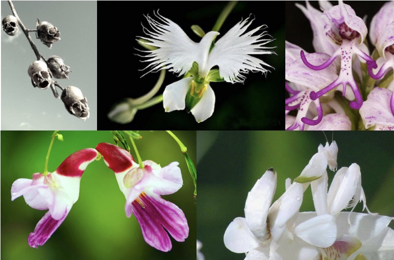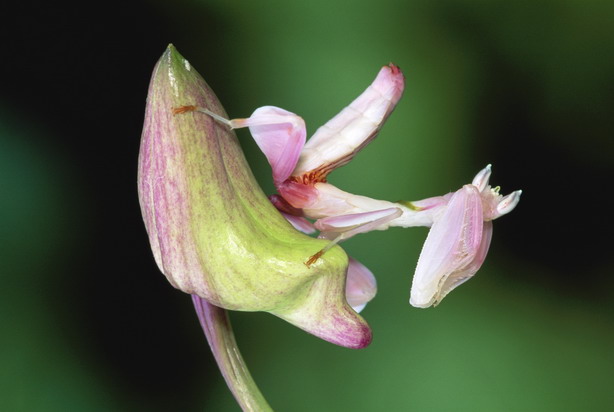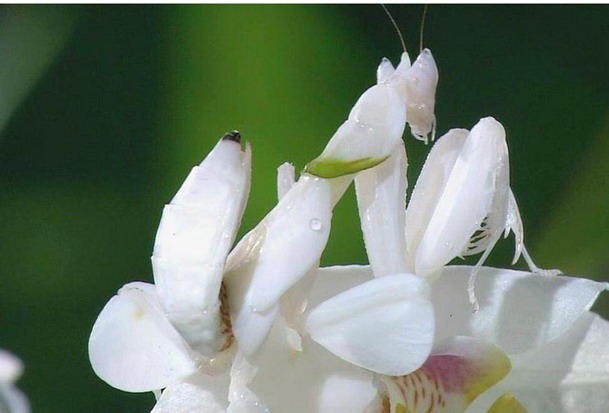 ทีเด็ดสุดท้าย เป็นเรื่องของสัตว์ที่อยากทำตัวเป็นคุณแอบเลียนแบบดอกไม้บ้าง นั่นคือ ตั๊กแตนตำข้าวที่อำพรางกายให้ดูเหมือนดอกกล้วยไม้ พบทั่วไปในป่าเขตร้อนชื้นแถบเอเชียตะวันออกเฉียงใต้ มีชื่อเรียกแตกต่างกันไป อาทิ ตั๊กแตนต่อยมวยกล้วยไม้ ตั๊กแตนตำข้าวกล้วยไม้สีชมพู ตามความคล้ายคลึงและพฤติกรรมที่เลียนแบบดอกกล้วยไม้ ลำตัวของมันมีสีสันสดใส หรือขาวล้วน และมีลักษณะพิเศษ คือ สามารถเปลี่ยนสีได้