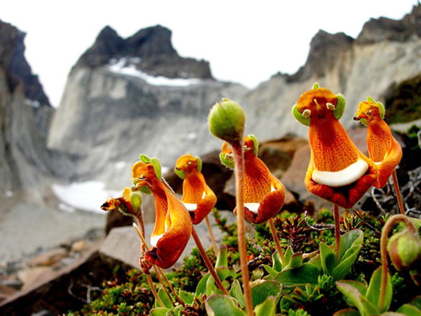 มีชื่อวิทยาศาสตร์ว่า Calceolaria Uniflora เป็นดอกไม้หน้าตาประหลาดที่เขียวชอุ่มตลอดปี มีถิ่นกำเนิดทางตอนใต้ของทวีปอเมริกาใต้ ชาร์ลส์ ดาร์วิน นักธรรมชาติวิทยาชาวอังกฤษ เป็นผู้ค้นพบครั้งแรกขณะเดินทางทั่วอเมริกาใต้ ระหว่างค.ศ. 1831-1836 ลำต้นสูงไม่เกิน 4-5 นิ้ว ออกดอกตลอดฤดูร้อน เมื่อดอกบานมีลักษณะคล้ายถุง ยาวประมาณ 2 นิ้ว มีสีเหลืองส้ม แต้มด้วยจุดด่างสีแดง ส่วนที่มีลักษณะเหมือนปากอ้า มีแถบสีขาว เพื่อล่อนกเข้ามากินและผสมเกสร
