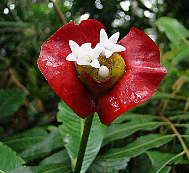 เป็นต้นไม้ที่ผ่านวิวัฒนาการมาอย่างยาวนาน จนกลายเป็นสิ่งที่เห็นในปัจจุบัน เพื่อดึงดูดให้นกฮัมมิ่งเบิร์ดและผีเสื้อมาผสมเกสรดอกไม้ ส่วนที่แลดูคล้ายริมฝีปากสีแดงสดมันวาวน่าจูบนั้น เป็นกลีบฐานดอกที่มีลักษณะคล้ายใบไม้ ซึ่งจะบานออกอวดโฉมดอกแท้จริงซึ่งมีสีขาวสวยงาม