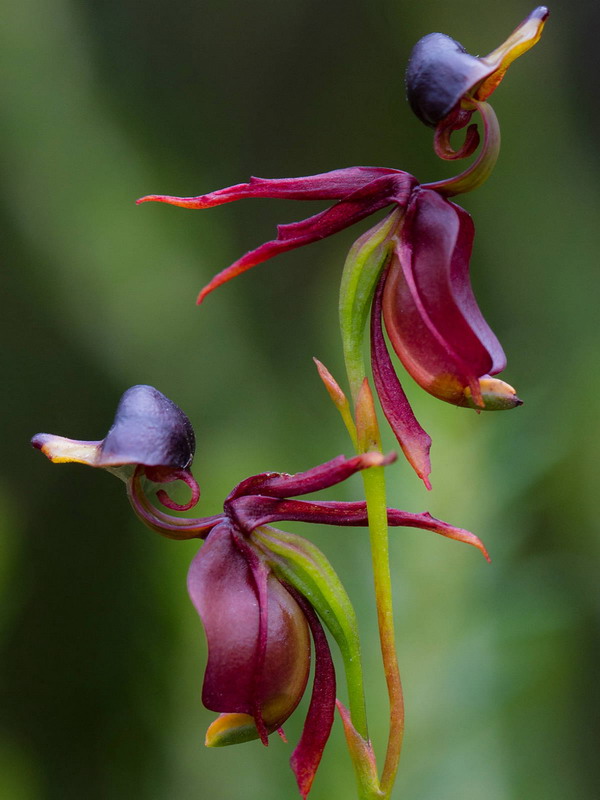 มีชื่อวิทยาศาสตร์ว่า Caleana เป็นกล้วยไม้ดินขนาดเล็ก สูงราว 45 ซม. พบในประเทศออสเตรเลีย ตั้งแต่รัฐควีนส์แลนด์ไปทางตอนใต้ของประเทศ และเกาะแทสมาเนีย ดอกกล้วยไม้ชนิดนี้มีสีน้ำตาลแดง (บางครั้งมีสีเขียวและจุดเข้ม ซึ่งหาได้ยาก) มีใบเดี่ยวที่โคนต้น ออกดอกในช่วงฤดูร้อน เหตุที่ถูกตั้งชื่อว่า Duck Orchid เนื่องจากกลีบดอกแลดูคล้ายเป็ดกำลังโผบินยกปีกสูงขึ้น โดยเฉพาะอย่างยิ่งกลีบดอกบนที่ดูเหมือนปากเป็ด