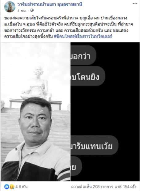 พร้อมระบุข้อความว่า "ขอแสดงความเสียใจกับครอบครัวพี่อำนาจ บุญเอื้อ คน บ้านเขื่องกลาง อ เขื่องใน จ อุบล พี่คือฮีโร่ตัวจริง คนที่รับลูกกระสุนคือน่าจะเป็น พี่อำนาจ ขอคาราวะวีรกรรม ความกล้า และ ความเสียสละด้วยครับ และ ขอแสดงความเสียใจอย่างสุดซึ้งครับ"
