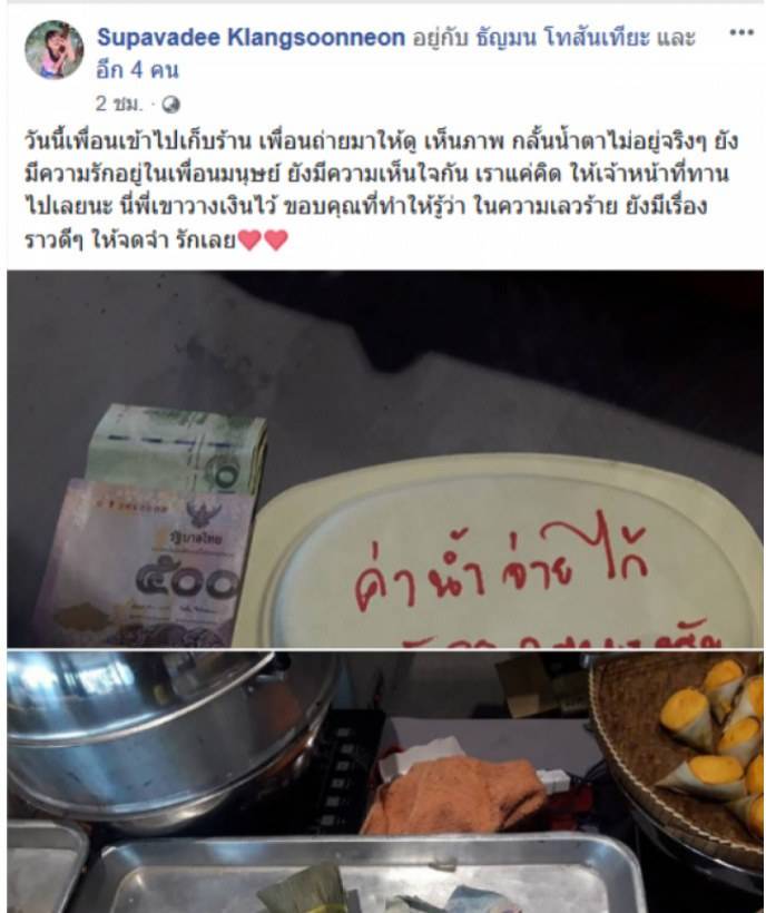 “วันนี้เพื่อนเข้าไปเก็บร้าน เพื่อนถ่ายมาให้ดู เห็นภาพ กลั้นน้ำตาไม่อยู่จริงๆ ยังมีความรักอยู่ในเพื่อนมนุษย์ ยังมีความเห็นใจกัน เราแค่คิด ให้เจ้าหน้าที่ทานไปเลยนะ นี่พี่เขาวางเงินไว้ ขอบคุณที่ทำให้รู้ว่า ในความเลวร้าย ยังมีเรื่องราวดีๆ ให้จดจำ รักเลย”