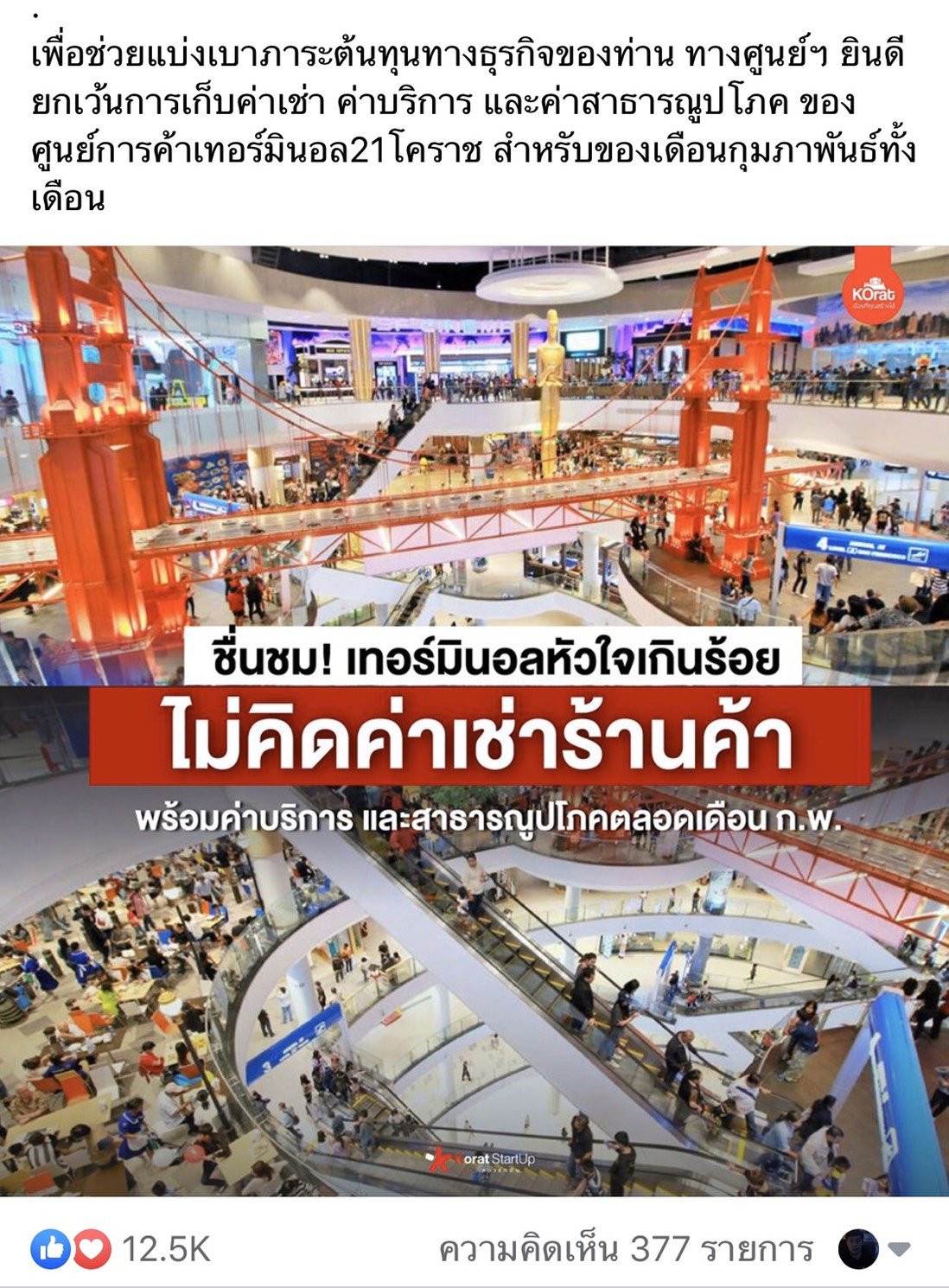 “จากเหตุการณ์ที่น่าส ะ เ ทื อ น ใ จ ที่เกิดขึ้นในจังหวัดนครราชสีมา ในวันที่ 8 กุมภาพันธ์ที่ผ่านมา ส่งผลกระทบต่อการเปิดให้บริการของ ศูนย์การค้าเทอร์มินอล21โคราช และส่งผลต่อการดำเนินกิจการของร้านค้าภายในศูนย์ฯให้ไม่ได้รับความสะดวกแล้วนั้นเพื่อช่วยแบ่งเบาภาระต้นทุนทางธุรกิจของท่าน ทางศูนย์ฯ ยินดียกเว้นการเก็บค่าเช่า ค่าบริการ และค่าสาธารณูปโภค ของศูนย์การค้าเทอร์มินอล21โคราช สำหรับของเดือนกุมภาพันธ์ทั้งเดือน"