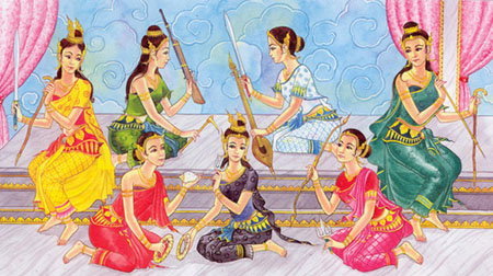 นางสงกรานต์นั้นเป็นธิดาของท้าวกบิลพรหม หรือท้าวมหาสงกรานต์ และเป็นนางฟ้าอยู่บนสรวงสวรรค์ชั้นจาตุมหาราช (สวรรค์ชั้นที่ 1 ในทั้งหมด 6 ชั้น) ซึ่งมีหน้าที่ในการรับศีรษะของท้าวกบิลพรหมแห่รอบเขาพระสุเมรุในแต่ละรอบปี หรือในวันสงกรานต์นั้นเอง โดยมีเกณฑ์กำหนดที่ว่าวันสงกรานต์ คือวันที่ 13 เมษายน ตรงกับวันใดก็ให้นางสงกรานต์ประจำวันนั้นเป็นผู้แห่ นางสงกรานต์มีทั้งหมด 7 องค์ ได้แก่