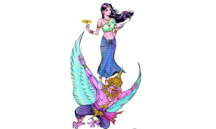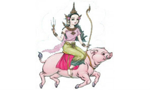 รากษสเทวีเป็นนางสงกรานต์ประจำวันอังคาร ทัดดอกบัวหลวง มีโมรา (หิน) เป็นเครื่องประดับ ภักษาหาร คือ โลหิต (เลือด) อาวุธคู่กาย พระหัตถ์ขวาถือตรีศูล พระหัตถ์ซ้ายถือธนู เสด็จประทับเหนือวราหะ (หมู)