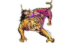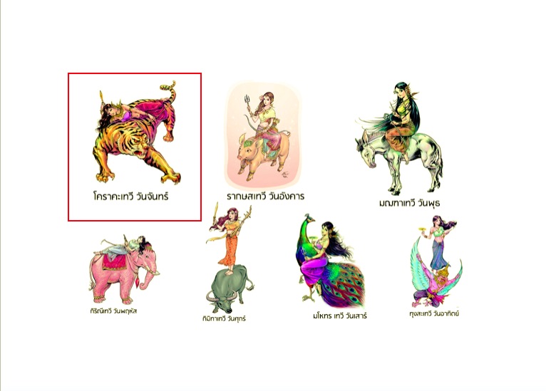 โคราคะเทวีเป็นนางสงกรานต์ประจำวันจันทร์ ทัดดอกปีป มีมุกดาหาร (ไข่มุก) เป็นเครื่องประดับภักษาหาร คือ เตละ (น้ำมัน) อาวุธคู่กาย พระหัตถ์ขวาถือพระขรรค์ พระหัตถ์ซ้ายถือไม้เท้า เสด็จประทับเหนือพยัคฆ์ (เสือ)