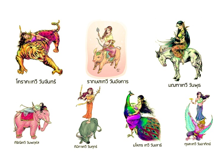 ทุงษะเทวีเป็นนางสงกรานต์ประจำวันอาทิตย์ ทัดดอกทับทิม มีปัทมราค (แก้วทับทิม) เป็นเครื่องประดับ ภักษาหาร คือ อุทุมพร (มะเดื่อ) อาวุธคู่กาย พระหัตถ์ ขวาถือจักร พระหัตถ์ซ้ายถือสังข์ เสด็จไสยาสน์เหนือปฤษฎางค์ครุฑ