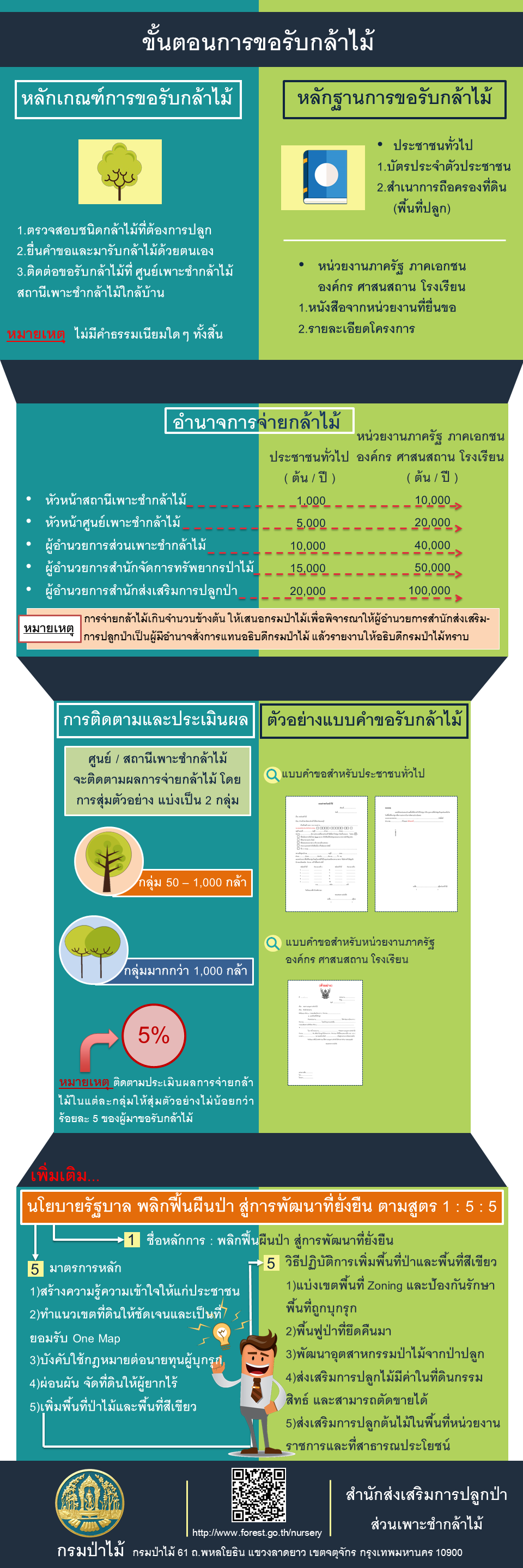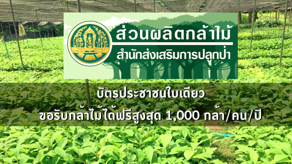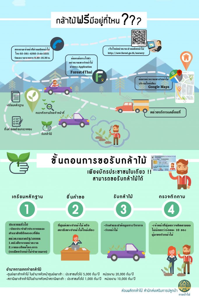 3. ติดต่อขอรับกล้าไม้ได้ที่ศูนย์เพาะชำกล้าไม้ สถานีเพาะชำกล้าไม้ และหน่วยงานที่ได้รับมอบหมายให้มีหน้าที่แจกจ่ายกล้าไม้ โดยไม่ต้องชำระค่าธรรมเนียมใด ๆ ทั้งสิ้น