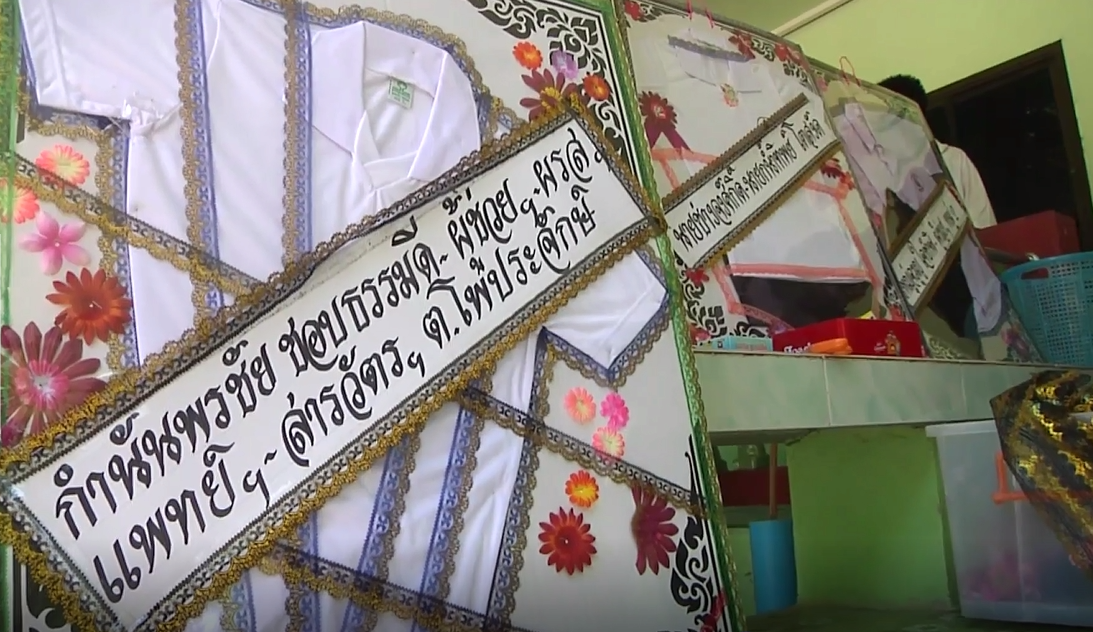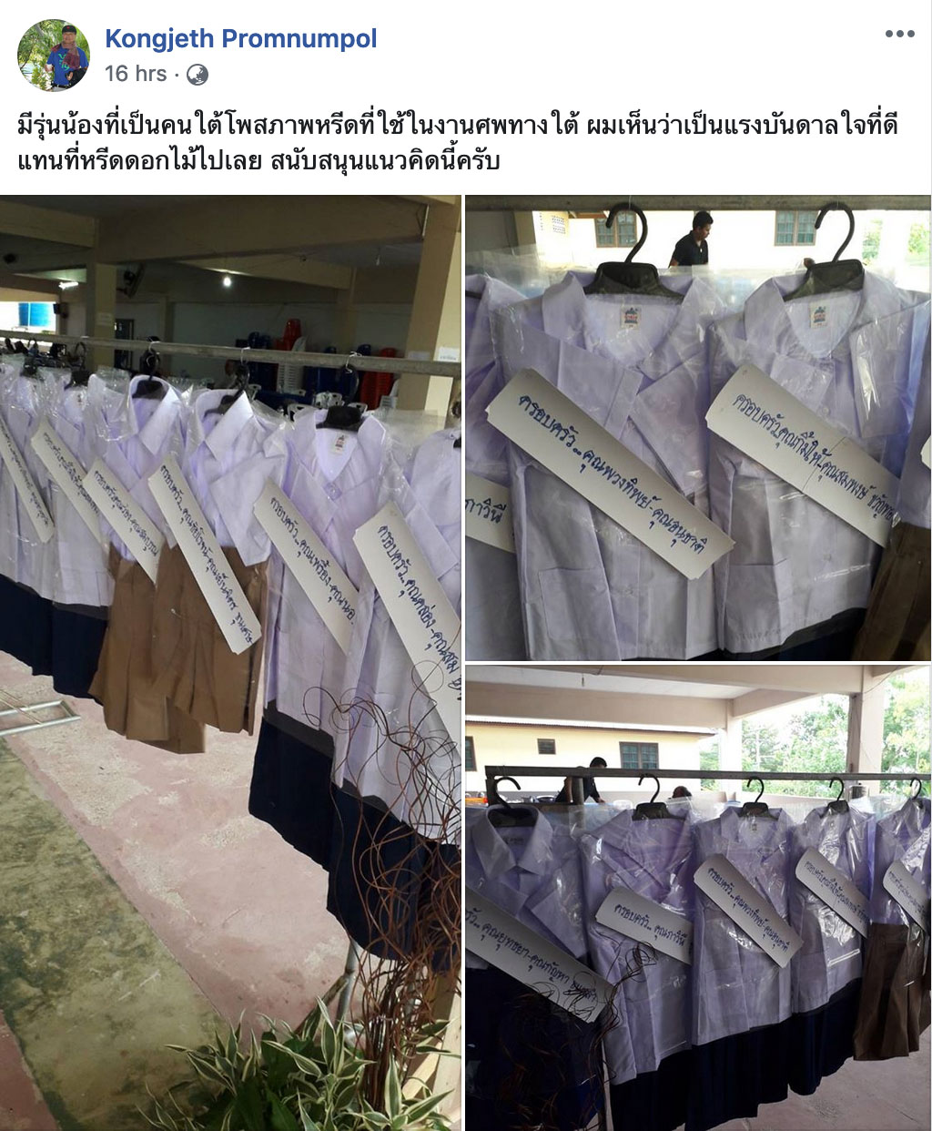 มีผู้ใช้เฟซบุ๊ก "Kongjeth Promnumpol" ได้โพสต์รูปภาพพวงหรีดชุดนักเรียนในงานศพโดยใช้แทนดอกไม้สด ซึ่งถือว่าป็นแนวคิดที่ดี เพราะนอกจากนี้จะเป็นการร่วมรณรงค์เรื่องสิ่งแวดล้อมแล้ว ยังนำไปใช้ประโยชน์ช่วยเหลือนักเรียน และไม่สร้างภาระในการกำจัดขยะซึ่งมาจากพวงหรีดดอกไม้สดให้กับวัดอีกด้วย