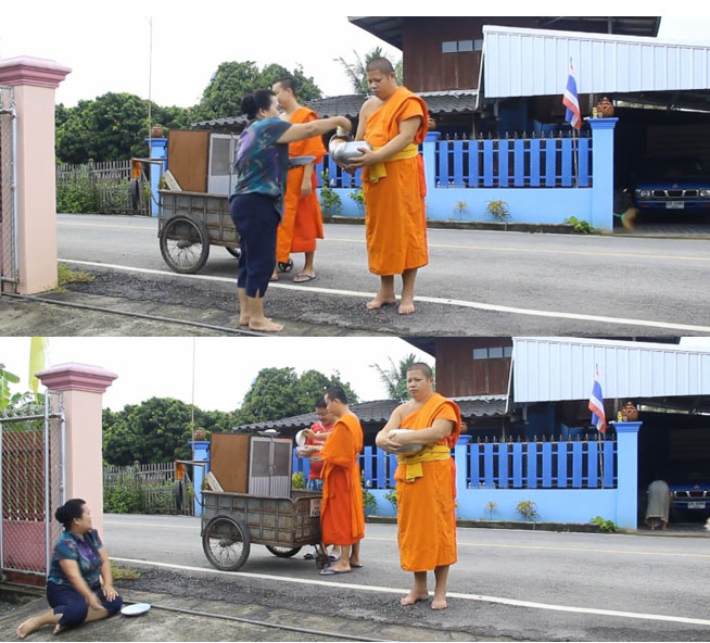 เมื่อญาติโยมนำอาหารที่ใส่จานชามของพวกเขาถวายให้พระ อาตมาก็จะนำจานชามของชาวบ้านที่เต็มไปด้วยอาหารมาเปลี่ยนใส่เป็นจานชามของทางวัด จากนั้นก็ใส่ตู้กับข้าวเพื่อความสะอาด เพื่อเป็นการลดใช้ถุงพลาสติก และโฟม