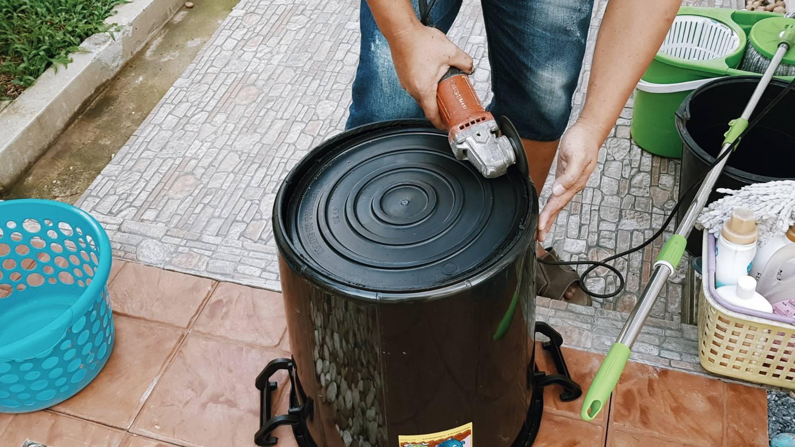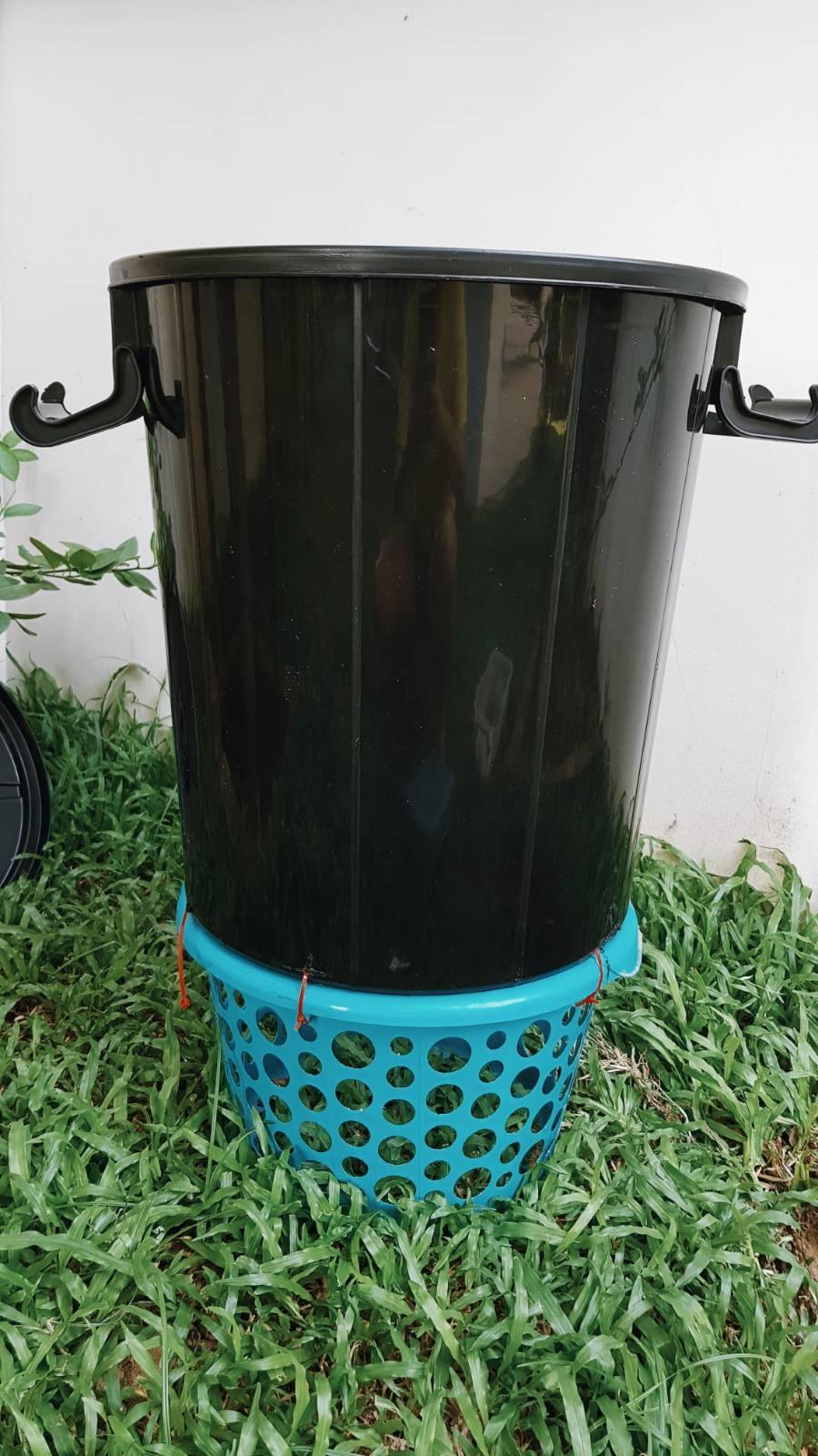 2. คว่ำถังพลาสติกขนาดใหญ่ลงบนปากตะกร้าให้พอดี จากนั้นนำเชือกมาผูกมัดให้ติดกัน ตัดก้นถังใบใหญ่ออกและส่วนที่ตัดออกนำมาทำเป็นฝาปิด